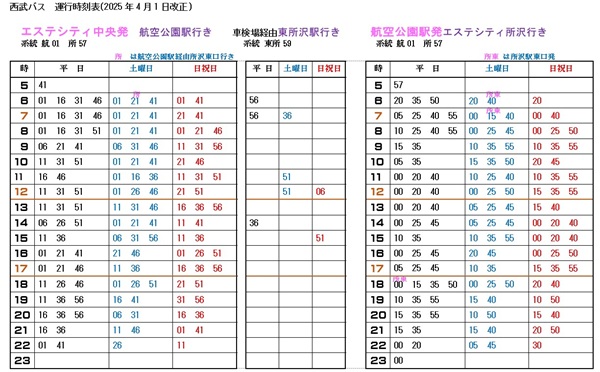 エステシティ中央発 と 航空公園駅発(エステシティ所沢行き)の西武バスの時刻表です