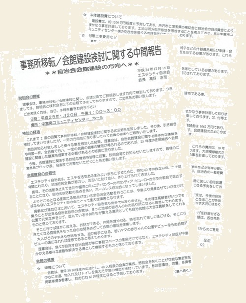 また、自治会は2010年(平成22年)に会館建設について会員の方々から意見を聴取するなどさまざまな角度から検討を重ねた結果、自治会館を建設する方向で進めることとしました。