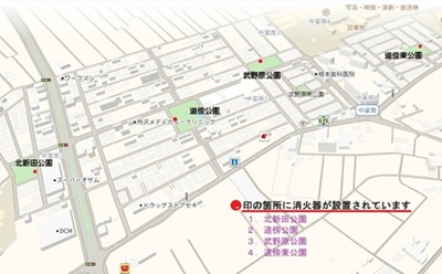 自治会が管理している消火器が下の地図の印のところに置いてありますので、いざという時にはご使用いただきたいと思います。